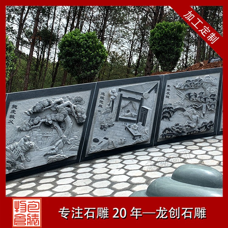 在墓園會使用到的石雕制品有很多,除了我們一開始會想到的石雕墓碑以外,還有些墓園會安裝石雕欄桿和石雕涼亭、石雕浮雕,墓園石雕欄桿除了起到安全防護作用外,還具有裝飾作用,而石雕涼亭的主要作用就是供人休息用的,石雕浮雕主要作用就是裝飾了,此套石雕墓圍的浮雕圖案是二十四孝。