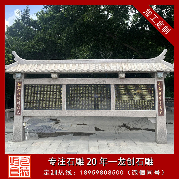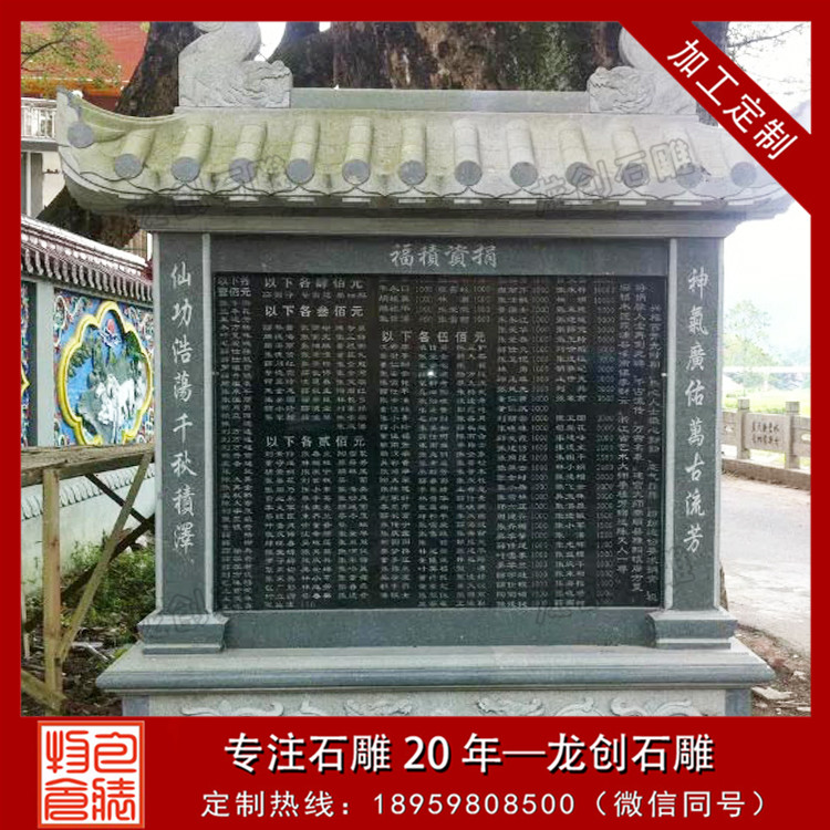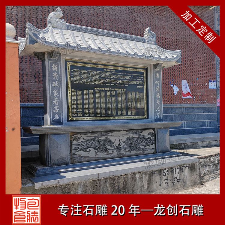碑體雕刻融合傳統(tǒng)技藝與現(xiàn)代數(shù)控工藝,資深雕刻師精準把控每一刀細節(jié),可實現(xiàn)浮雕、陰刻、圓雕等多種工藝,碑周可雕刻祥云、瑞獸、松竹梅等吉祥紋飾,既提升碑體的文化質(zhì)感,又寓意福澤綿長、功德永存。碑文排版遵循嚴謹規(guī)范,字體選用楷書、隸書等莊重字體,搭配描金、涂黑工藝,讓字跡清晰醒目、耐磨不褪色,每一筆都飽含敬意,每一段文字都直擊人心,讓功德精神跨越歲月、代代相傳。