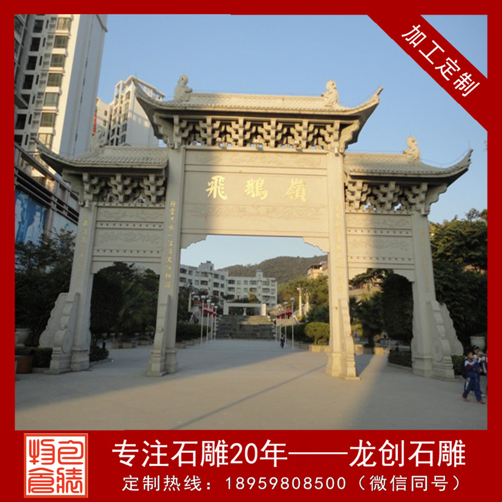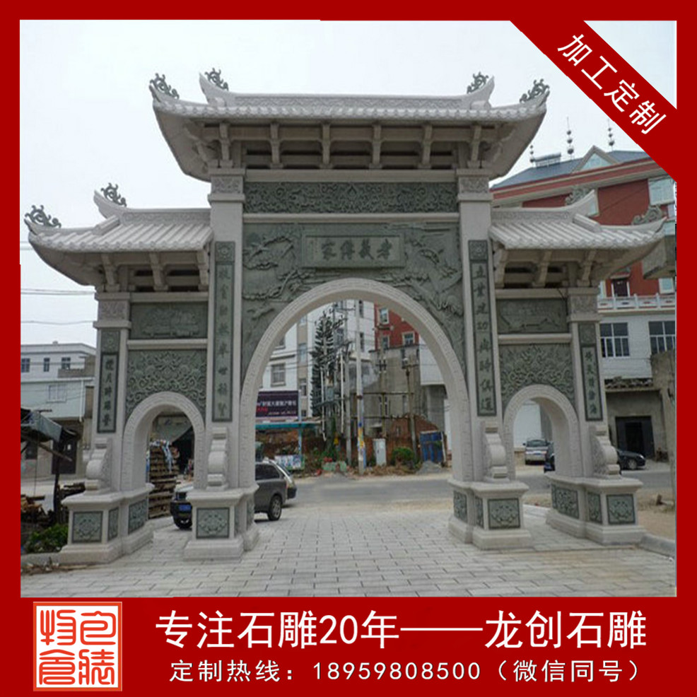 新農(nóng)村石雕牌坊選擇最多的是三門形式,由四根柱子,中間門大一點(diǎn),兩側(cè)是小門,正反兩面花紋一般都是相同的。上面有牌匾,可以雕刻上文字,中間兩根柱子上也可以雕刻對(duì)聯(lián)等文字或者其他圖案。