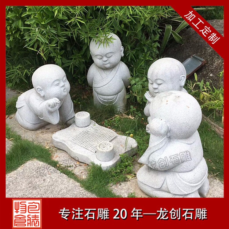 石雕精品小沙彌就是用優(yōu)質(zhì)石材雕刻制作的小和尚造型,一般都是10歲以下的孩童雕塑。由于小孩的天真爛漫,各種各樣有趣的造型都會(huì)做出來,比如下棋的小沙彌,睡姿的小沙彌、嬉戲的以及功夫小沙彌,打掃衛(wèi)生的等等,也有一些修行的小沙彌造型,比如參禪打坐的造型,敲木魚的造型。石雕小沙彌的百態(tài)千姿是寺廟諸佛菩薩雕塑里面較多的一種,也是讓信眾們發(fā)自內(nèi)心的喜愛和尊敬的一種佛教弟子塑像。
