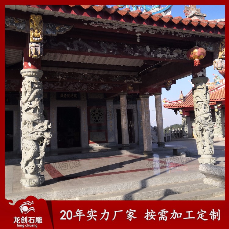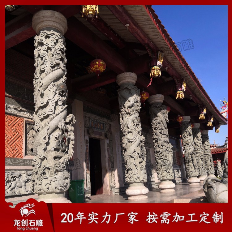 石雕龍柱又叫石雕龍抱柱、盤(pán)龍柱、滾龍柱、蟠龍柱,指在石頭上雕刻龍紋的具有指示作用的柱子。龍柱全身雕刻龍紋,一般柱子上下雕刻兩條龍,龍浮雕一般雕刻深度在3-5cm,也有雕刻7-10cm的,深度雕刻的越深龍紋越明顯,龍的神圣形象也就越突出,整個(gè)柱子也就越具有莊嚴(yán)神圣感。