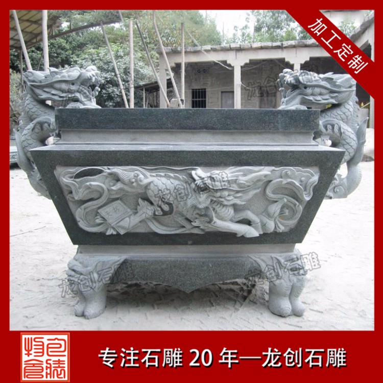 惠安長(zhǎng)方形石雕香爐采用優(yōu)質(zhì)花崗巖精雕細(xì)琢而成,用以盛載香支,以作日常供奉神明之用。香爐上面的門主要作用是起到空氣流通和清理香灰的作用。開六個(gè)門主要是怕刮風(fēng),這樣就是有風(fēng),煙也會(huì)隨風(fēng)飄走。而我們?cè)谒略褐卸嘁?jiàn)于圓形的和長(zhǎng)方形的香爐,圓形香爐都有三足,一足在前,兩足在后,長(zhǎng)方形香爐一般是四足,是如法的放置;常以之譬喻佛教中的三寶,缺一不可。