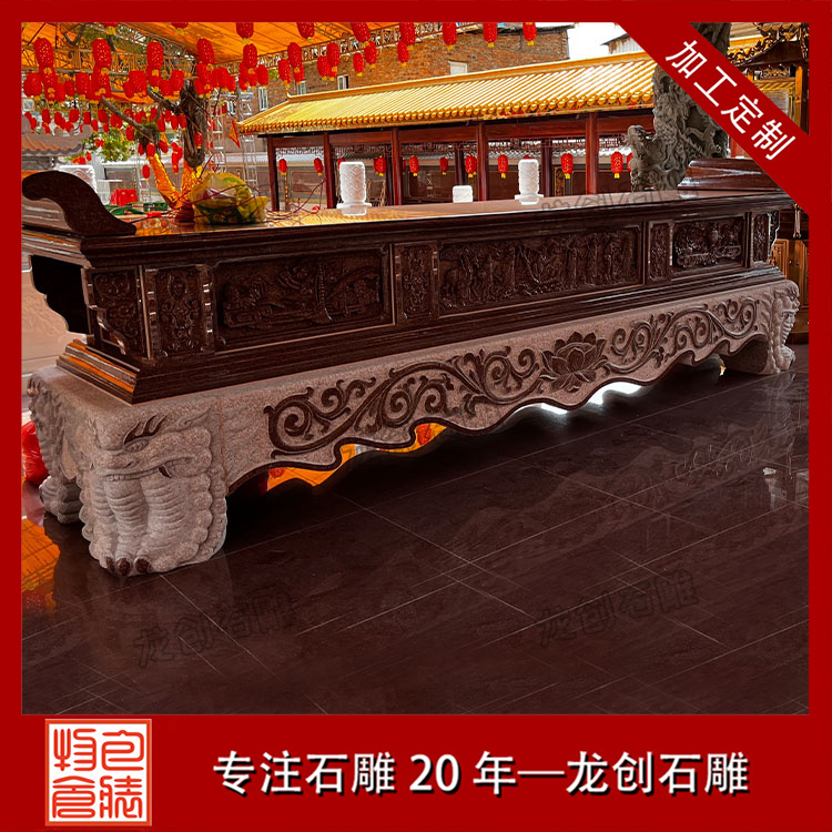 雕刻圖案也是石供桌文化內(nèi)涵的重要組成部分。常見的浮雕有龍鳳呈祥、蓮花凈土、祥云瑞氣等,分別寓意權(quán)威、吉祥、清凈和祥和。這些裝飾不僅提升了整體藝術(shù)美感,也寄托著人們的美好愿望。