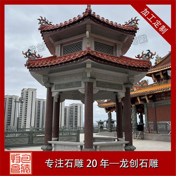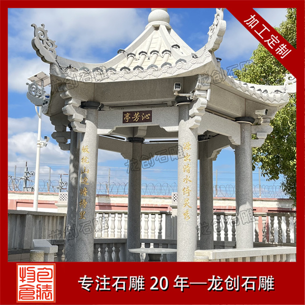 從工藝構(gòu)造來看,標準六角涼亭包含臺基、柱礎(chǔ)、檐柱、梁枋、屋面、寶頂六大組成部分。臺基常采用須彌座樣式增強穩(wěn)定感;六根檐柱通過精確的榫卯結(jié)構(gòu)與梁枋連接;屋面由六塊梯形石板精準拼接形成流暢的排水斜面;頂部寶頂作為收束構(gòu)件兼具裝飾功能。雕刻工藝以淺浮雕為主,常在柱礎(chǔ)處飾以蓮紋,欄板處刻有簡化的幾何紋樣或自然圖案,保持整體風格的協(xié)調(diào)統(tǒng)一。