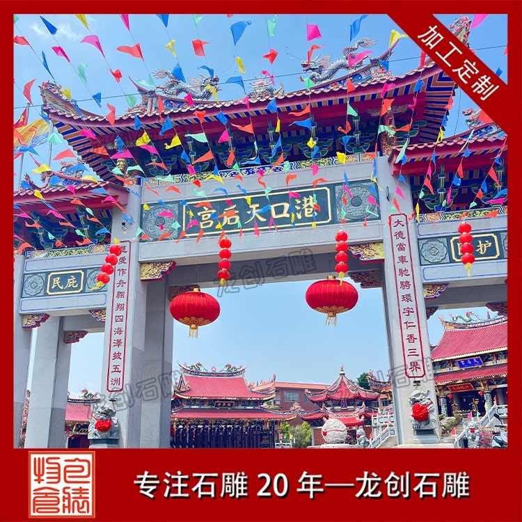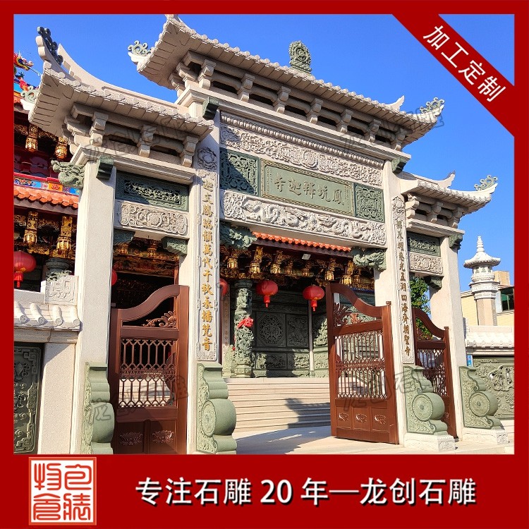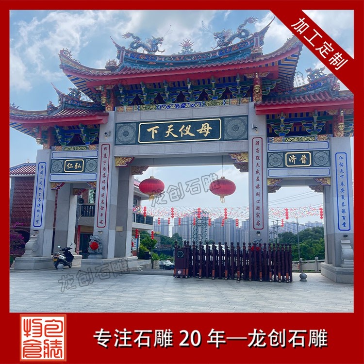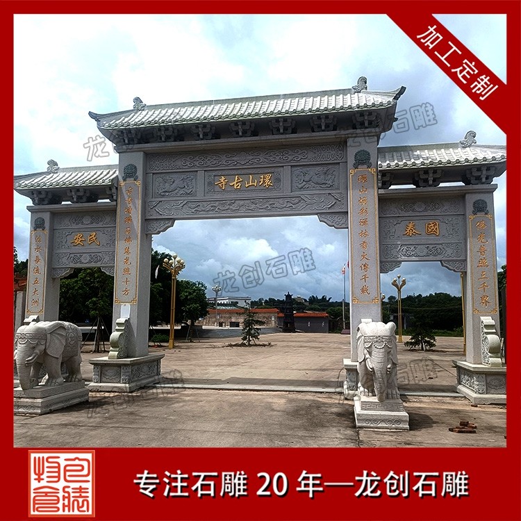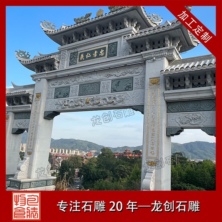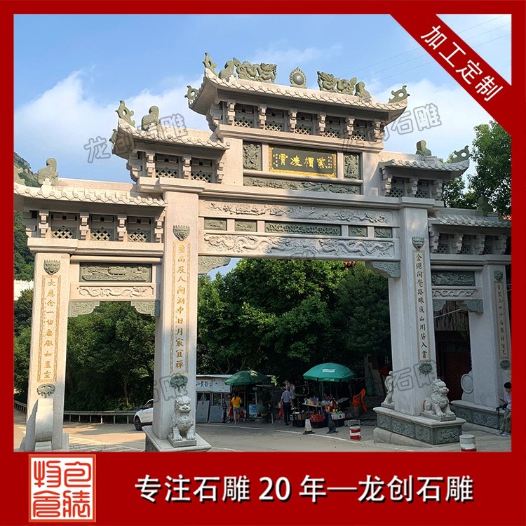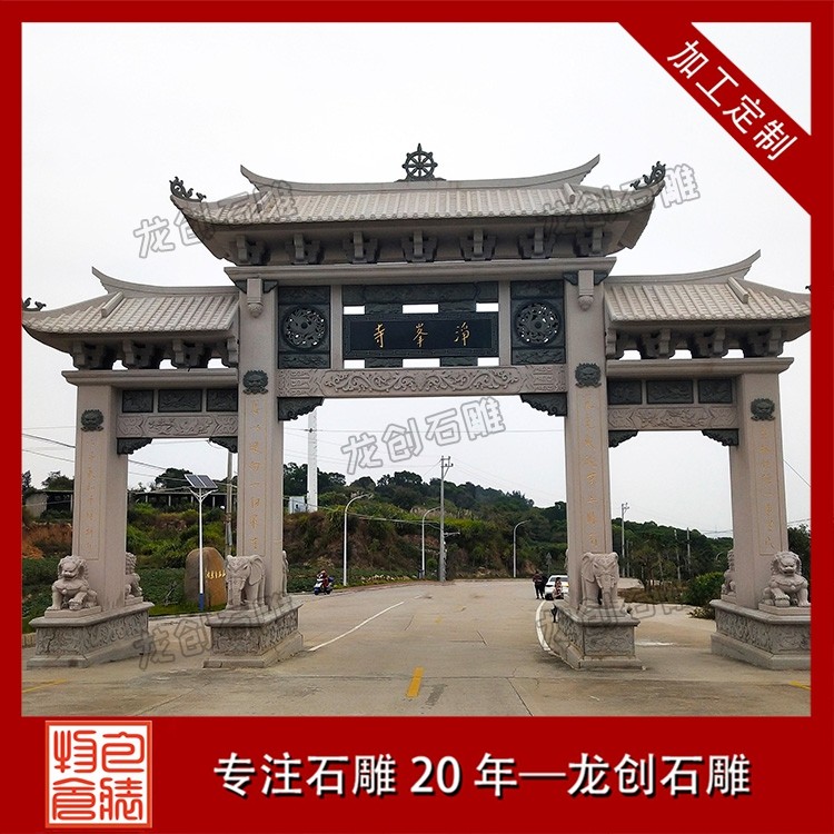 寺廟牌坊的風(fēng)格通常更為莊重古樸,色彩素雅,營(yíng)造出一種肅穆的氛圍。當(dāng)信徒或游客穿過(guò)牌坊的那一刻,仿佛從喧囂的俗世踏入了一片清涼圣境,世俗的煩惱被拋在身后,內(nèi)心自然而然地生出敬畏與虔誠(chéng) 。牌坊上的雕刻也極具宗教特色,常見(jiàn)的圖案不是凡間的飛禽走獸,而是具有佛教寓意的蓮花(象征圣潔)、八寶(象征吉祥) 等。它既是寺廟的標(biāo)志,也是引導(dǎo)眾生走向覺(jué)悟的精神前奏 。