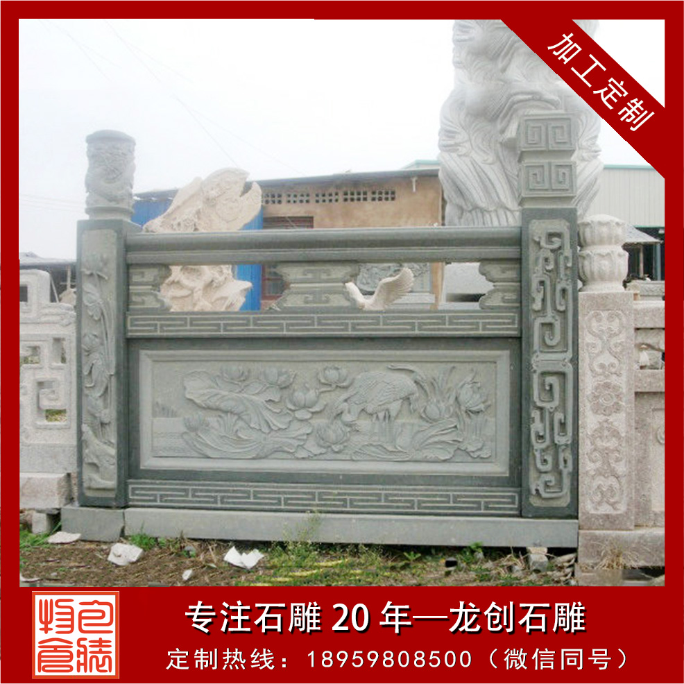 石雕欄桿不僅有安全維護(hù)作用,具有很好的裝飾效果。望柱柱頭常做成回雌形式,題材多為寓意吉祥的勸物、花頭等立體型;菊柱多飾成荷葉凈瓶形式,尋杖以線腳裝飾;欄板是重點(diǎn)裝飾的部分,常施以扮致的雌飾,題材廣泛,并與拄頭的內(nèi)容相呼應(yīng)。由立柱、墊塊、柱頭、抱鼓、欄板組成的石欄桿有時(shí)尚、環(huán)保、美觀、不變形、抗老化的優(yōu)點(diǎn),所以被廣泛應(yīng)用于交通橋梁、水利、公園等護(hù)欄工程。它的種類多種多樣,各種石材都可制作,常見的還是漢白玉欄桿、花崗石欄桿和青石欄桿。