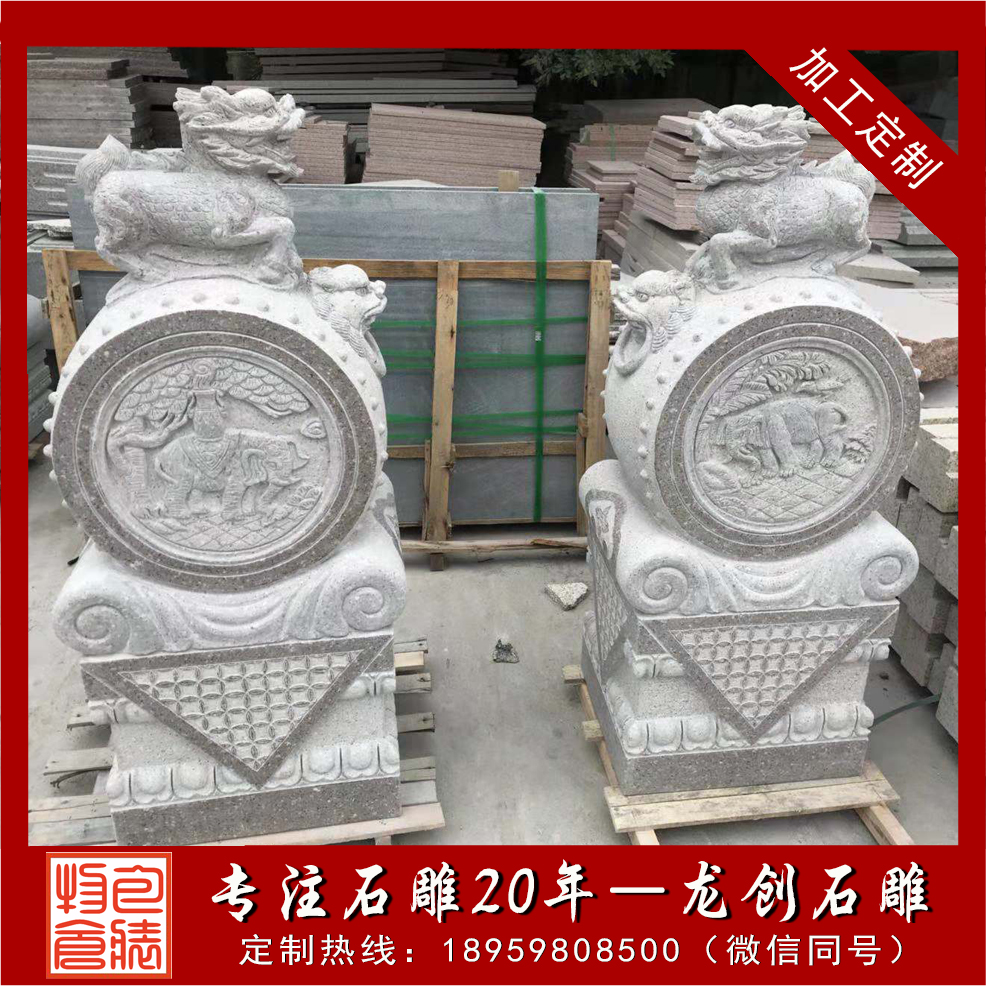 抱鼓石上雕刻麟、鳳、鹿、鶴、猴、鵲、蜂等瑞獸祥禽,形神兼?zhèn)?,姿態(tài)各異。如麒麟臥松、犀牛望月、獅子舞繡球、鶴鹿同春,還有三獅戲珠(三世戲酒)、四獅同堂(四世同堂)、五獅護(hù)欄(五世福祿)等圖案。另有在門前單獨(dú)立石獅,借助獅子的威猛守護(hù)大門,又因“獅”與“事”諧音,便以雙獅寓意“事事如意”、“事事平安”。守門的石獅,雄左雌右,雄獅腳下按一繡球,母獅腳下按一幼獅,繡球象征權(quán)力,幼獅象征子嗣,即表示“子嗣昌盛,世代為官”。